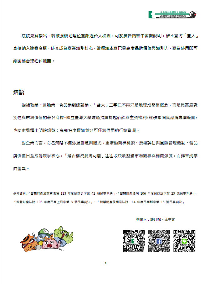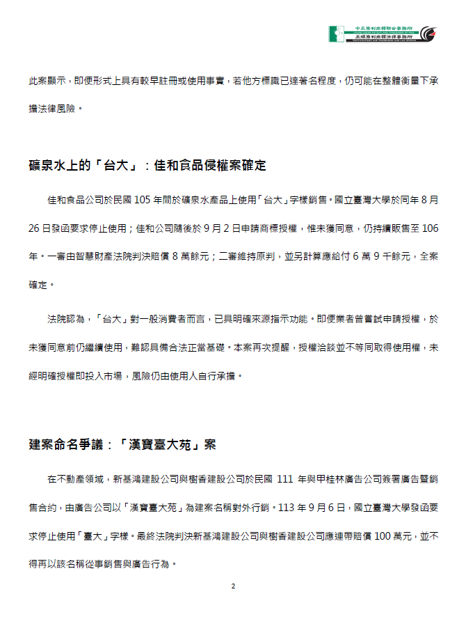 還記得在中正週報第117期中提及的「國立臺灣大學」與台大補習班間的商標爭議嗎?最終雙方以和解收場,補習班更名為「明明補習班」,為該案劃下句點。近期觀察發現,校方的維權行動並未止於補教產業,而是橫跨運輸、食品與不動產等多元領域,展現其對「台大」相關標識的高度重視。以下整理三則具代表性的判決與爭議發展,帶讀者一覽「台大」商標攻防戰的最新動態。