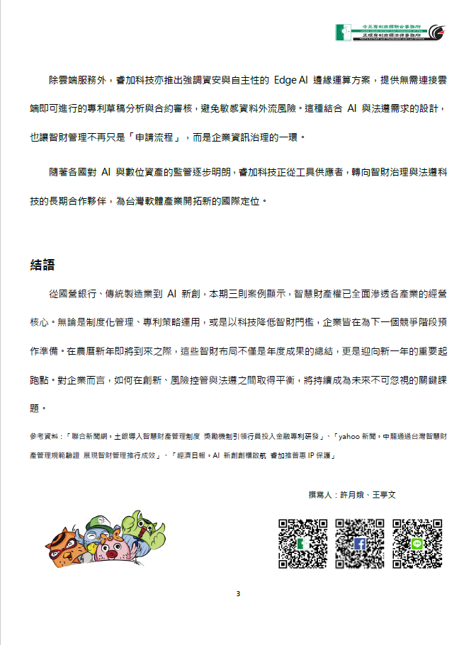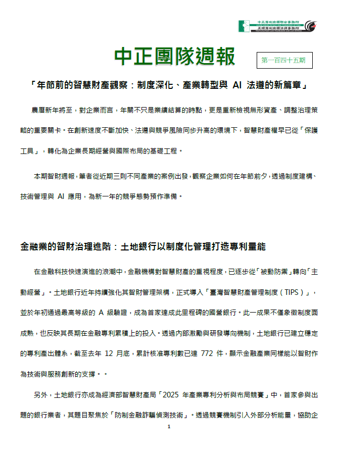 本期智財週報,筆者從近期三則不同產業的案例出發,觀察企業如何在年節前夕,透過制度建構、技術管理與 AI 應用,為新一年的競爭態勢預作準備。