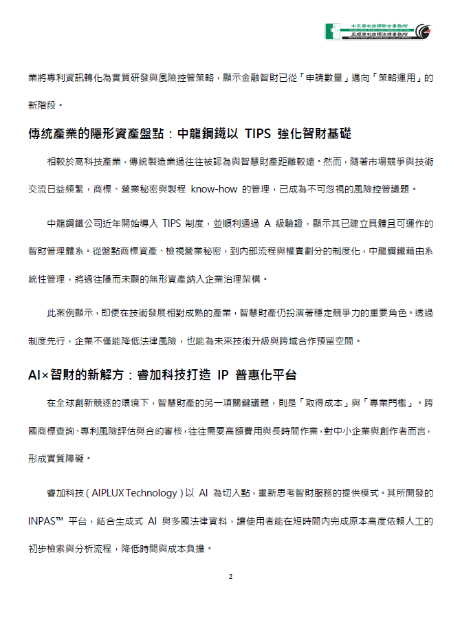 農曆新年將至,對企業而言,年關不只是業績結算的時點,更是重新檢視無形資產、調整治理策略的重要關卡。在創新速度不斷加快、法遵與競爭風險同步升高的環境下,智慧財產權早已從「保護工具」,轉化為企業長期經營與國際布局的基礎工程。