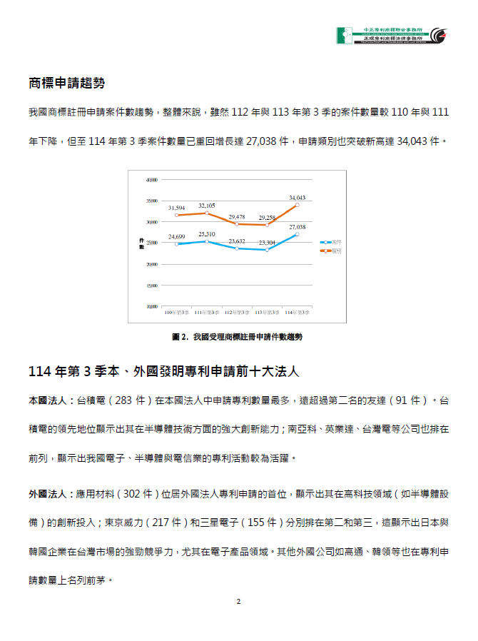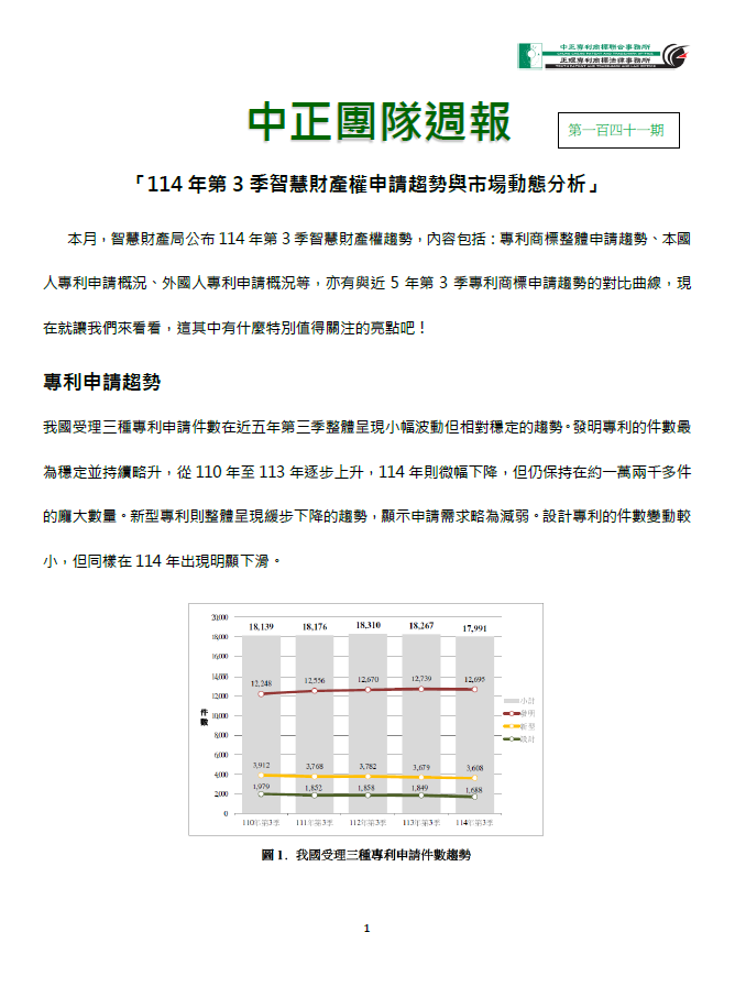 本月,智慧財產局公布114年第3季智慧財產權趨勢,內容包括:專利商標整體申請趨勢、本國人專利申請概況、外國人專利申請概況等,亦有與近5年第3季專利商標申請趨勢的對比曲線,現在就讓我們來看看,這其中有什麼特別值得關注的亮點吧!