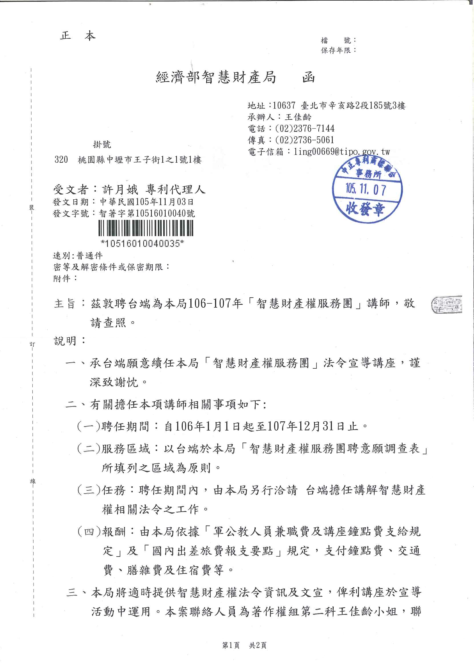 賀!許所長再度續任民國106-107年智慧財產局「智慧財產權服務團」法令宣導講座講師一職 許所長以她幽默風趣的談吐,搭上用心準備吸睛力極佳的課程內容 吸引了學員們的注意力,課程中帶領著學員們一起互動,使的學員們更加凝聚在課程中。 相信有上過許所長課程的學員們,都對許所長讚譽不已! 有機會遇到許所長的課程時,千萬不要錯過喔!!! 為了因應現今社會對智慧財產權的重視, 許所長也為有需求之企業單位提供員工教育訓練的服務,讓大家一同為智慧財產而努力!加油!