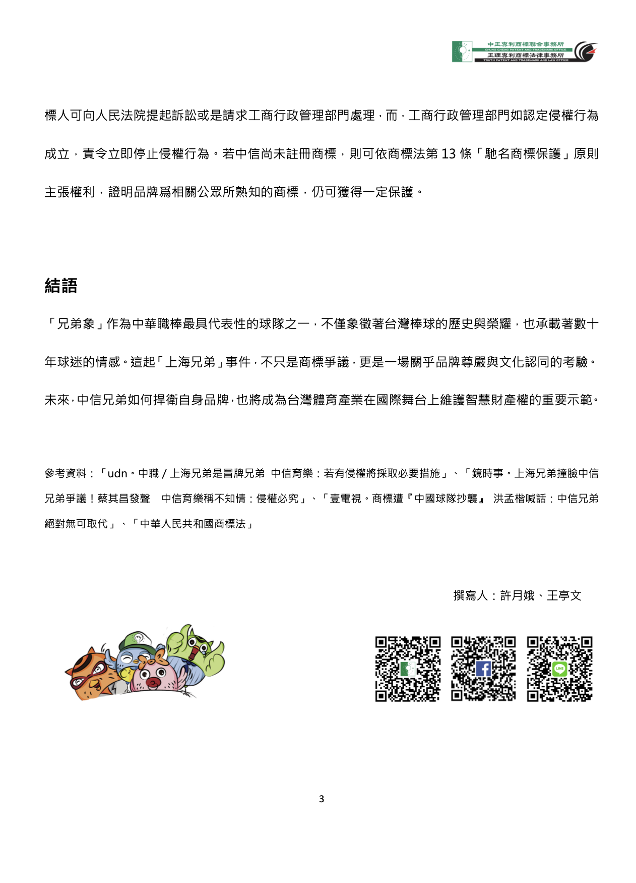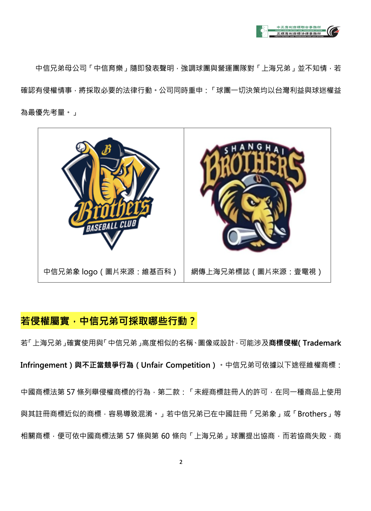 參考資料:「udn。中職/上海兄弟是冒牌兄弟 中信育樂:若有侵權將採取必要措施」、「鏡時事。上海兄弟撞臉中信兄弟爭議!蔡其昌發聲 中信育樂稱不知情:侵權必究」、「壹電視。商標遭『中國球隊抄襲』 洪孟楷喊話:中信兄弟絕對無可取代」、「中華人民共和國商標法」