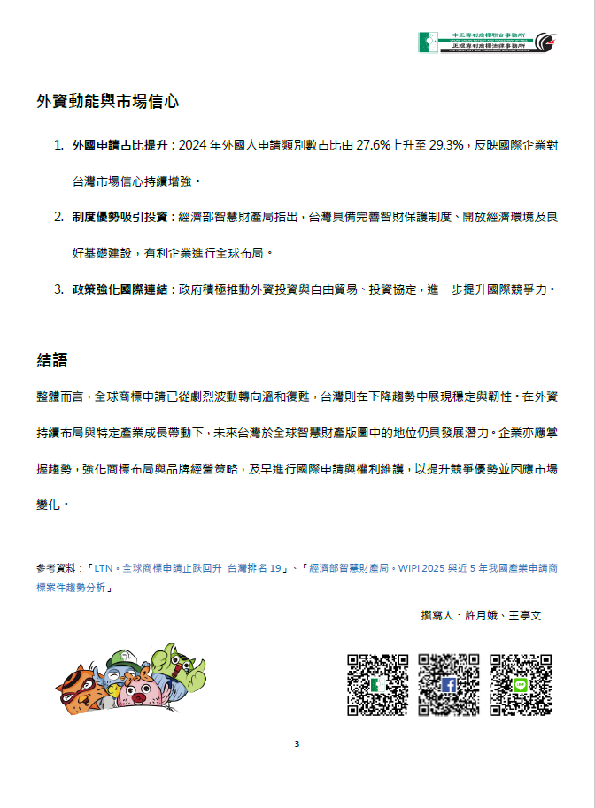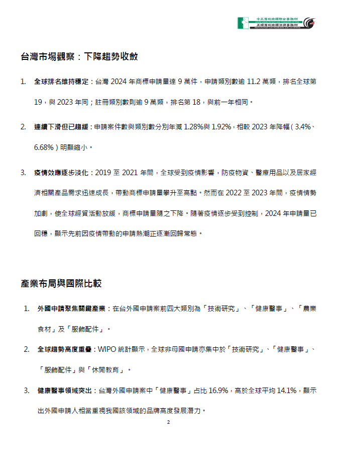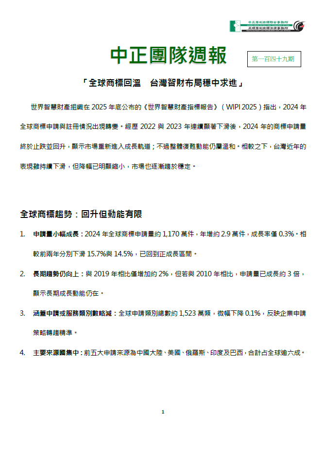 世界智慧財產組織在2025年底公布的《世界智慧財產指標報告》(WIPI 2025)指出,2024年全球商標申請與註冊情況出現轉變。經歷2022與2023年連續顯著下滑後,2024年的商標申請量終於止跌並回升,顯示市場重新進入成長軌道;不過整體復甦動能仍屬溫和。相較之下,台灣近年的表現雖持續下滑,但降幅已明顯縮小,市場也逐漸趨於穩定。